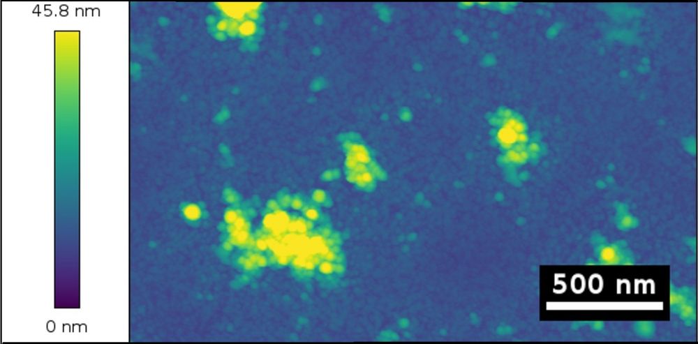 Na slici dobivenoj mikroskopom atomskih sila prikazane su laserski sintetizirane zlatne nanočestice – nanometarske strukture znatno manje od optičke difrakcijske granice, u čijem dimenzijskom području kvantni učinci određuju ponašanje materijala. Sliku je izradio student u sklopu svog diplomskog rada. Pozivamo vas da posjetite naše laboratorije i upoznate se s opremom koja takva istraživanja omogućuje.